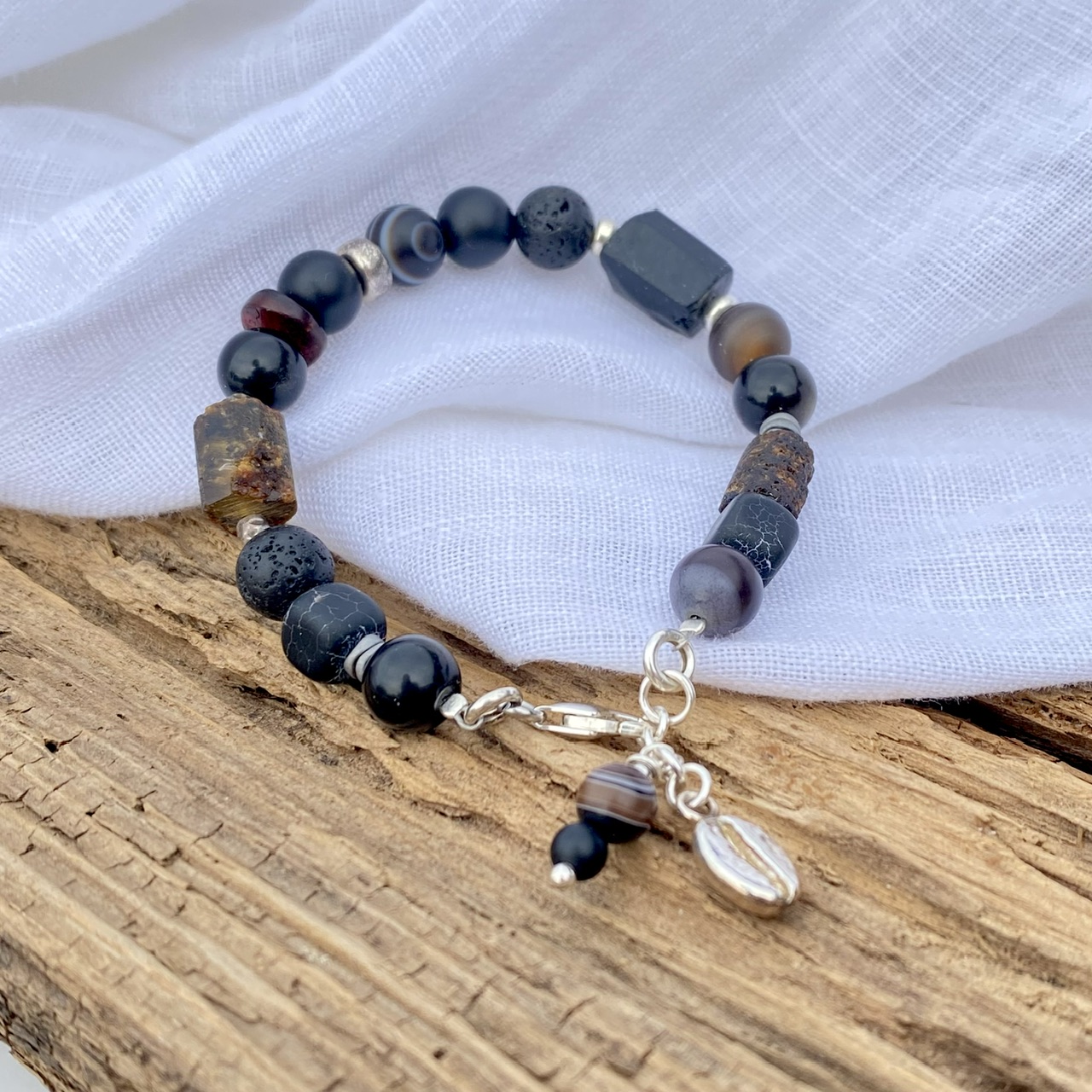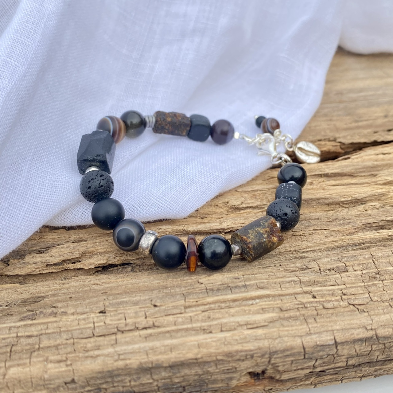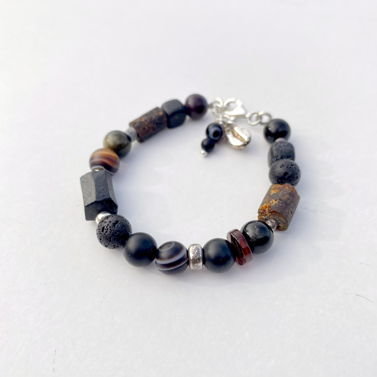 Kamienie: agat, bursztyn, onyks, czarny turmalin, hematyt, lawa wulkaniczna.