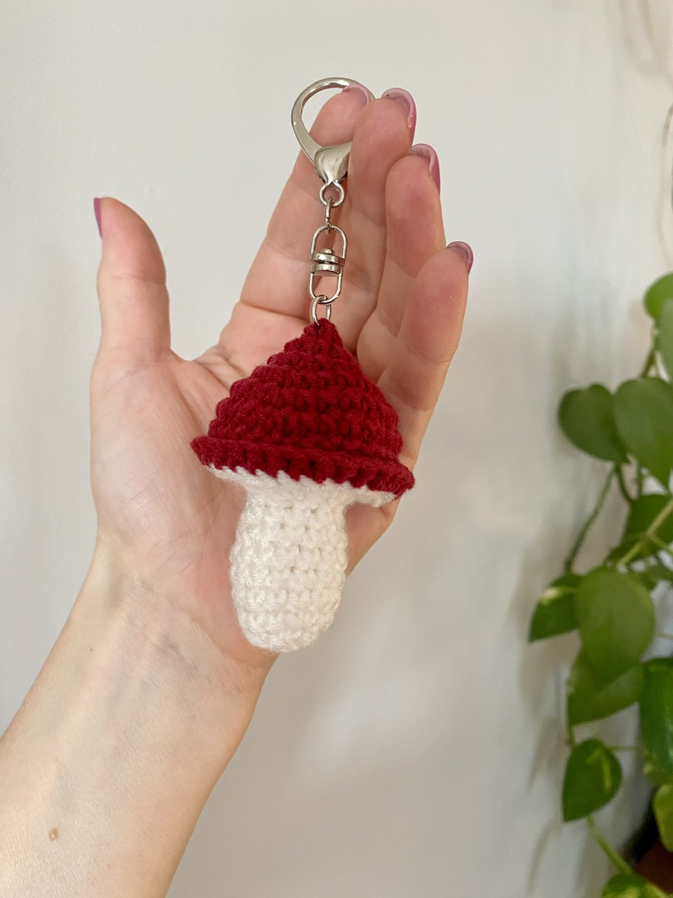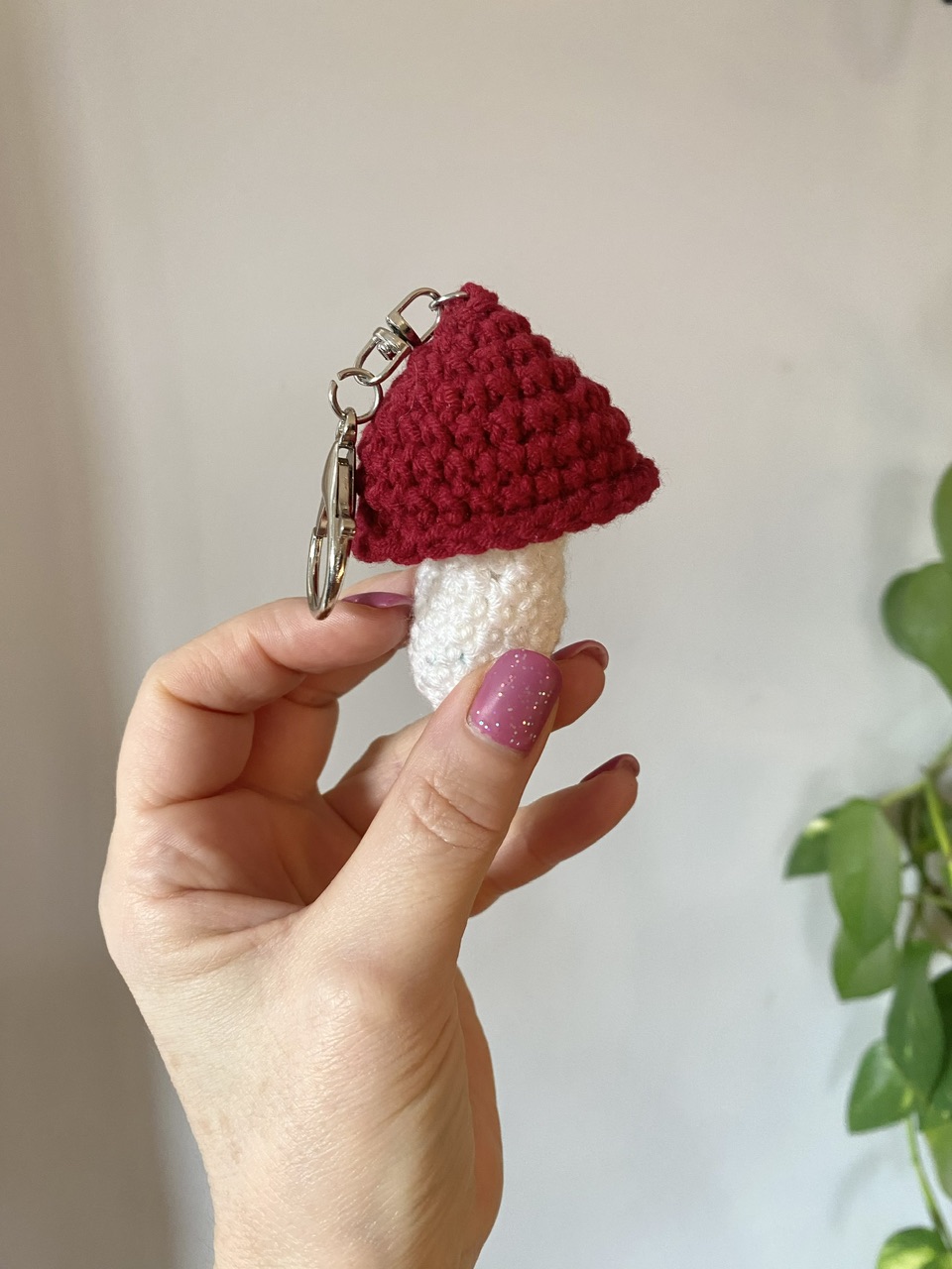 Uroczy brelok w kształcie grzybka wykonany na szydełku. Lekki i wygodny w użyciu.
