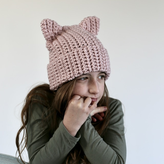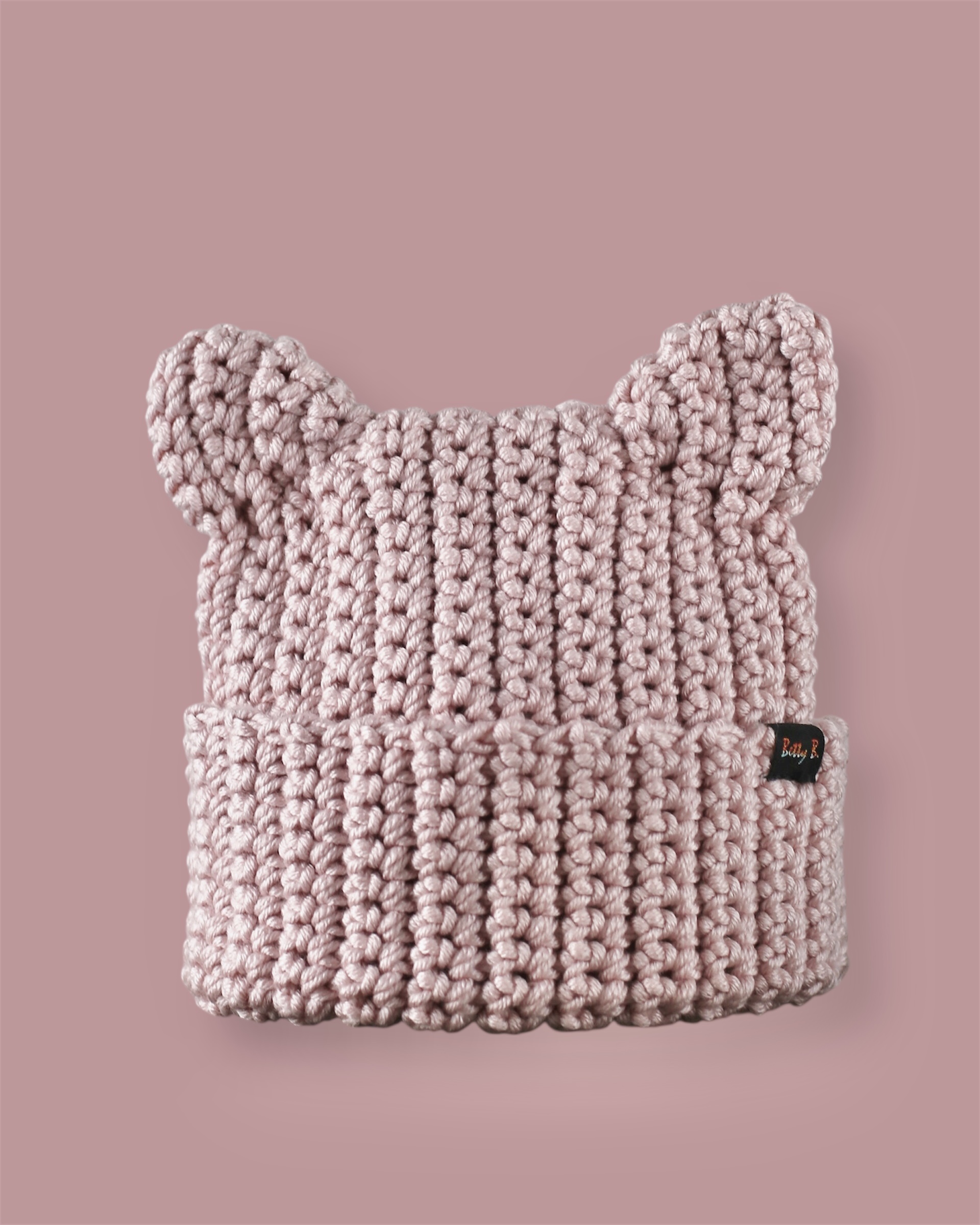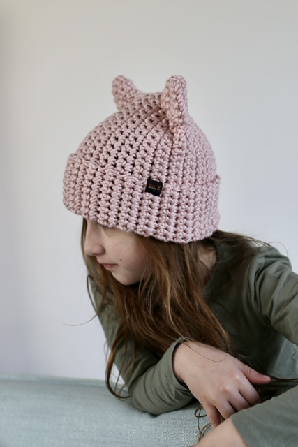 Zimowa czapka z uszami kota, wykonana ręcznie na szydełku z miękkiej włóczki akrylowej w kolorze jasnego, pudrowego różu.