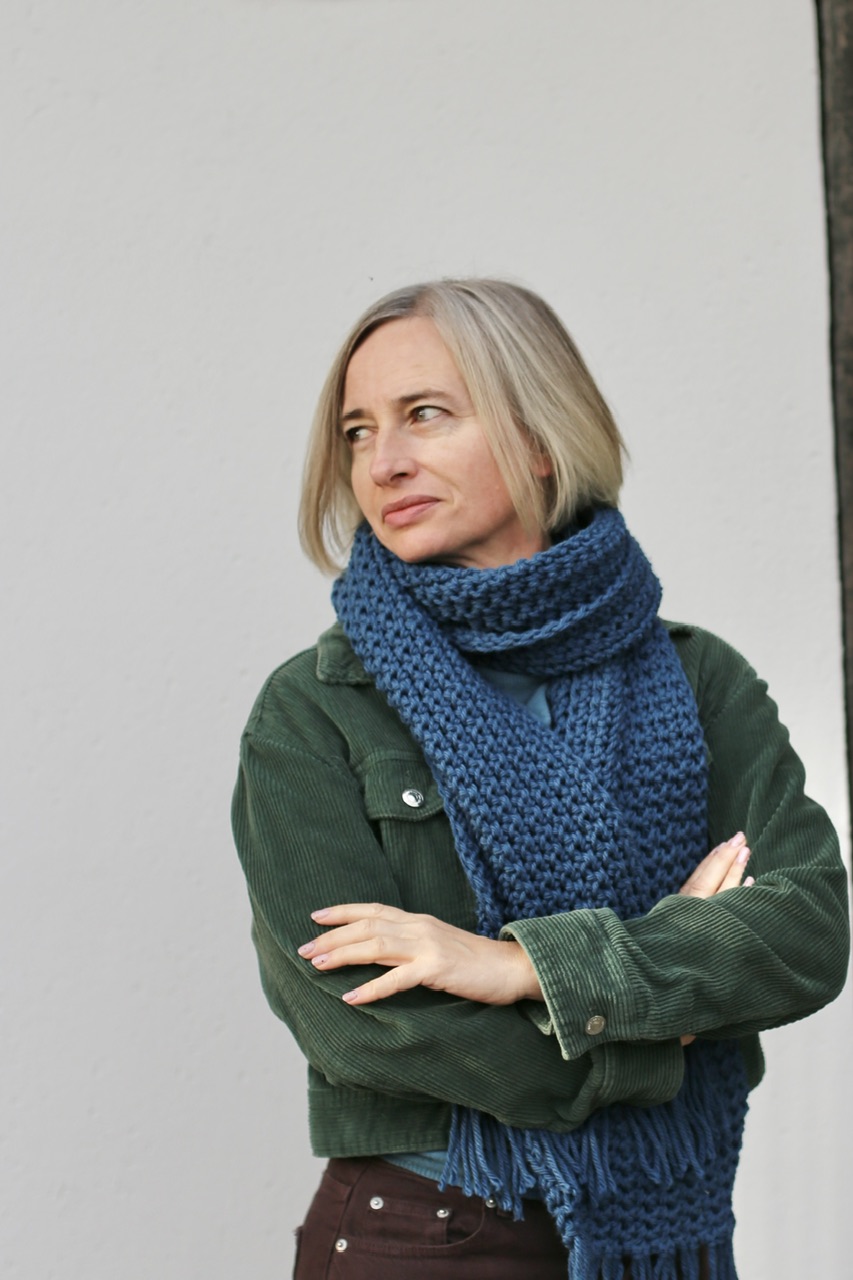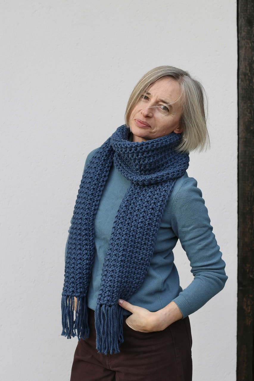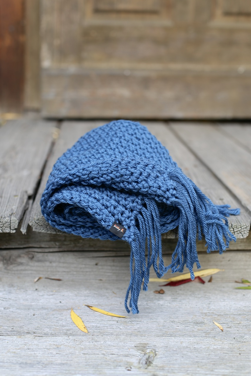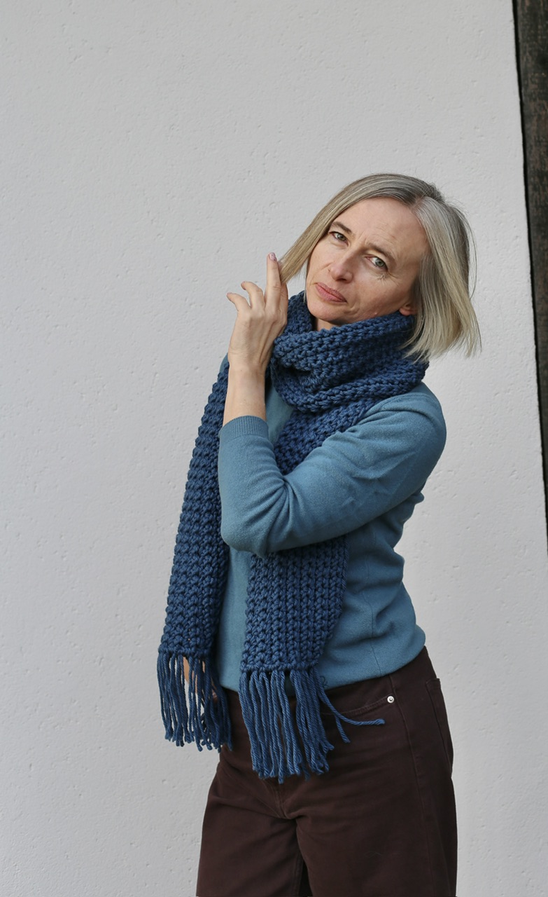 Długi, miękki, lejący szalik z frędzlami w ciepłym odcieniu niebieskiego