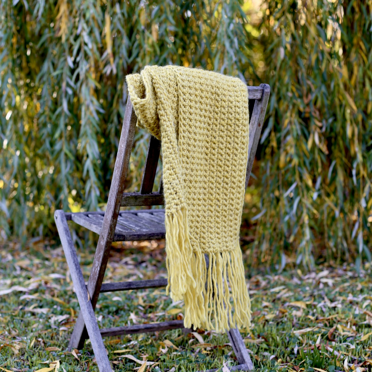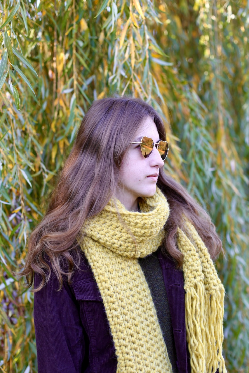 Długi, ciepły szalik z frędzlami w zgaszonym odcieniu zółtego